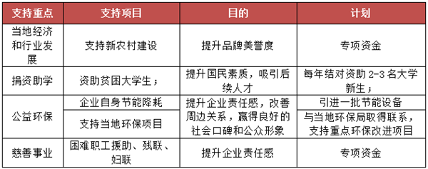 公司始終不忘回報社會,承擔社會責任,主要體現在以下四個重點:慈善捐助、教育文化以及重大災害事件救助,通過制定年度公益活動計劃,從預算、人員等方面保證有計劃地開展公益支持活動。