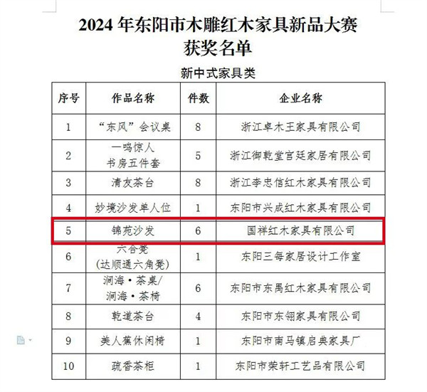 創(chuàng)新作為工藝美術(shù)行業(yè)永恒的追求,是本屆博覽會(huì)所關(guān)注的重點(diǎn)。國(guó)祥紅木憑借《錦苑沙發(fā)》在眾多原創(chuàng)佳作脫穎而出,被評(píng)為“2024年年度木雕紅木家具(新中式家具類(lèi))十大精品企業(yè)”稱(chēng)號(hào)。