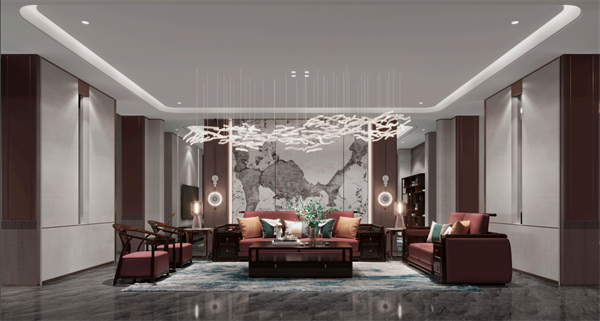 紅酸枝材質(zhì)的溫潤(rùn)色澤,在燈光的烘托下給客廳空間帶來(lái)溫暖的格調(diào),放大客廳的親切感,描繪中式的精致典雅。